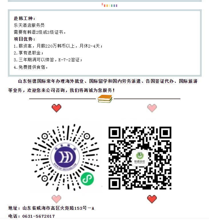 版權所有:山東恒德國際經濟技術合作有限公司 威海恒德職業培訓學校 地址:威海市高區火炬路153號-A 免費熱線:4006150009電話:(韓國部)+86-631-5672008(日本部)+86-631-5672006 (新加坡)+86-631-5672009 (留學部)+86-631-5672011 傳真:+86-631-5672028 郵 編:264209 郵箱:hengdeguoji@163.com51La| 策劃制作:威海雷迅網絡 魯ICP備19060589號-1 魯公網安備 37100302000191號
