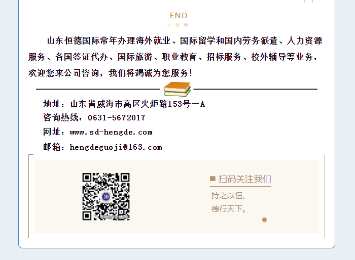 版權所有:山東恒德國際經濟技術合作有限公司 威海恒德職業培訓學校 地址:威海市高區火炬路153號-A 免費熱線:4006150009電話:(韓國部)+86-631-5672008(日本部)+86-631-5672006 (新加坡)+86-631-5672009 (留學部)+86-631-5672011 傳真:+86-631-5672028 郵 編:264209 郵箱:hengdeguoji@163.com51La| 策劃制作:威海雷迅網絡 魯ICP備19060589號-1 魯公網安備 37100302000191號
